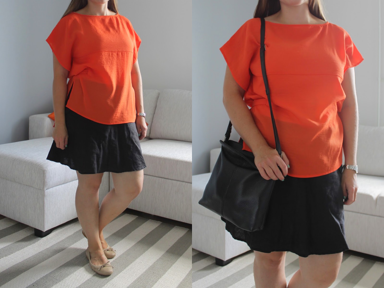 Musta pellavahame on myös viisiten vuotta vanha alelöytö H&M:stä. Se on oikea kesän luottovaatteeni kuumemmilla säillä ja tänä kesänä sekin on ollut paljon käytössä. Oranssi pusero taas on ale-löytö parin vuoden takaa ja sekin on päätynyt päälleni tänä kesänä useasti.